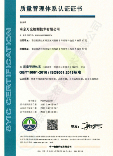 南京萬(wàn)全檢測(cè)技術(shù)有限公司,籌建于2013年1月,注冊(cè)資金500萬(wàn),公司坐落于南京經(jīng)濟(jì)技術(shù)開發(fā)區(qū)興智路6號(hào)興智科技園A棟17層,實(shí)驗(yàn)室占地面積1750余平米。公司是一家獲得省級(jí)CMA計(jì)量認(rèn)證資質(zhì)、具有獨(dú)立法人、政府認(rèn)可的綜合性、專業(yè)性的檢測(cè)機(jī)構(gòu)。環(huán)境監(jiān)測(cè)業(yè)務(wù)是其重要的檢測(cè)業(yè)務(wù)之一,目前已獲得省級(jí)計(jì)量資格認(rèn)可項(xiàng)目314項(xiàng),設(shè)備齊全,具有較強(qiáng)的技術(shù)能力。